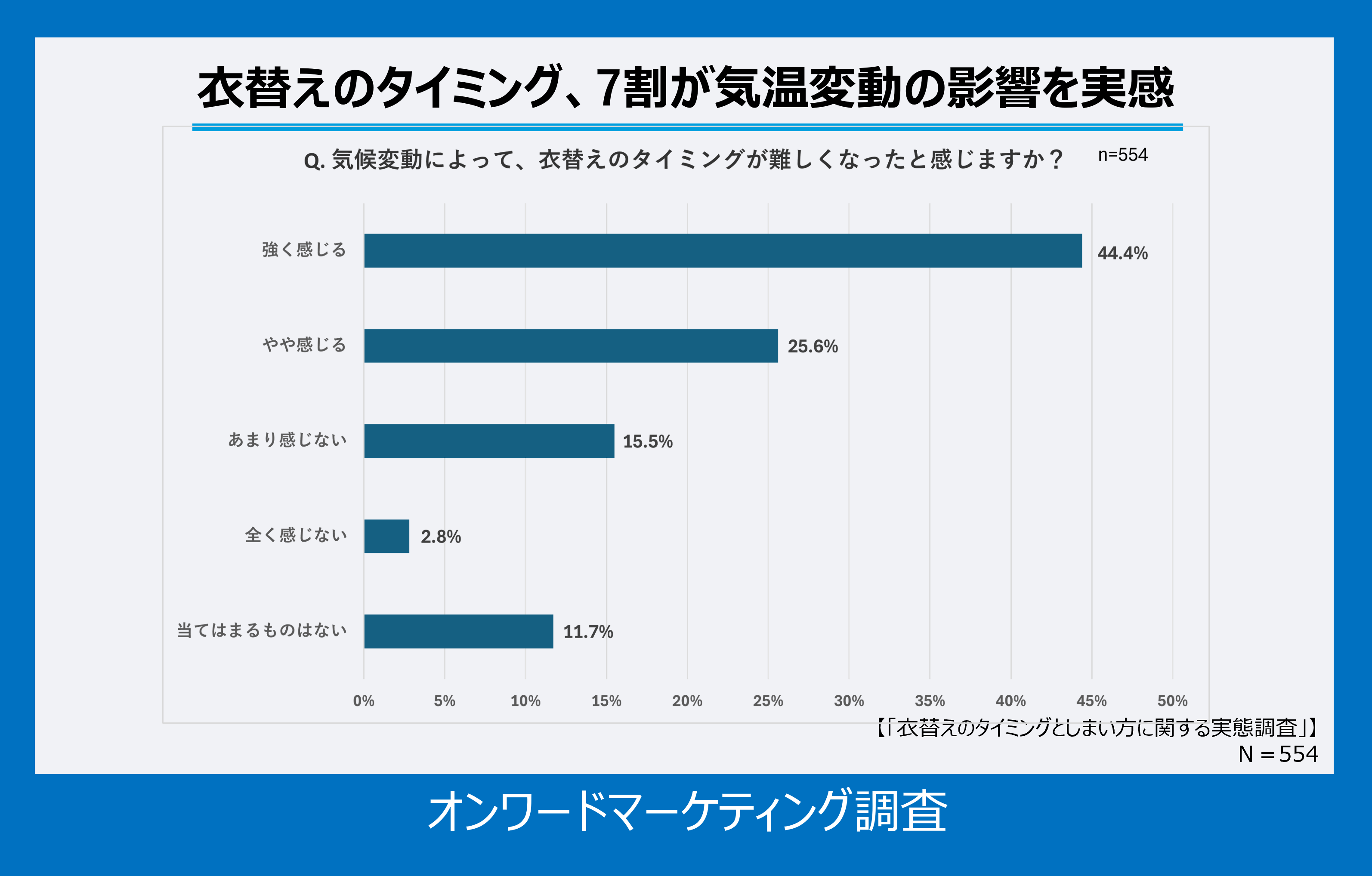 本調査により、気候変動(暑さの長期化や急な寒暖差)によって、衣替えのタイミングが難しくなったと「強く感じる」「やや感じる」と7割が回答し、多くの人が衣替え時の悩みとして挙げた収納・保管、手入れなどにどう影響するかを分析しました。