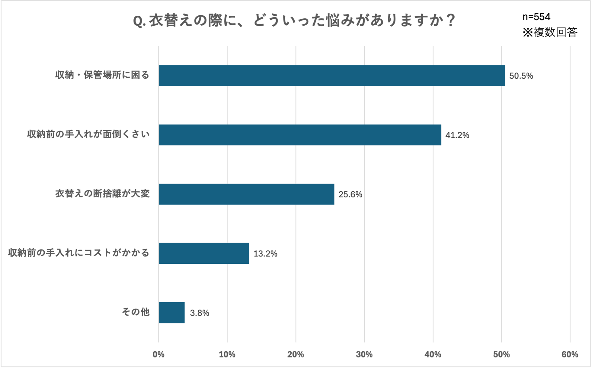 さらに、「衣替えの際に、どういった悩みがありますか?」という設問に対し、「収納・保管場所に困る」(50.5%)、「収納前の手入れが面倒くさい」(41.2%)、「衣替え前の断捨離が大変」(25.6%)などの回答が得られ、多くの人が衣替え時に様々な悩みを抱えていることが分かりました。
