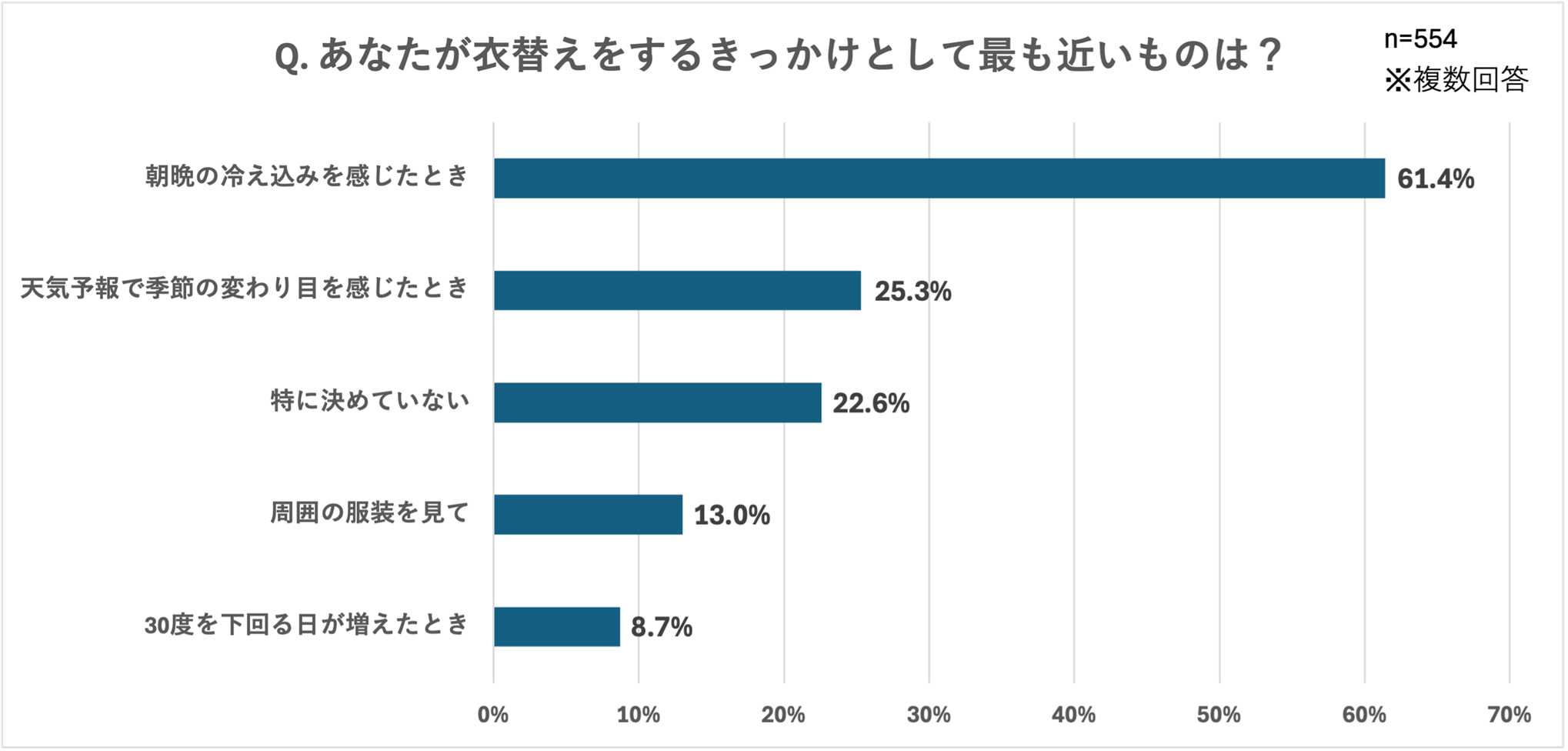 「あなたが衣替えをするきっかけとして最も近いものは?」との設問に対し、「朝晩の冷え込みを感じたとき」(61.4%)、「天気予報で季節の変わり目を感じたとき」(25.3%)、「30度を下回る日が増えたとき」(8.7%)など、気温の変化を実感するタイミングで衣替えを意識する人が多いことが分かりました。