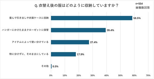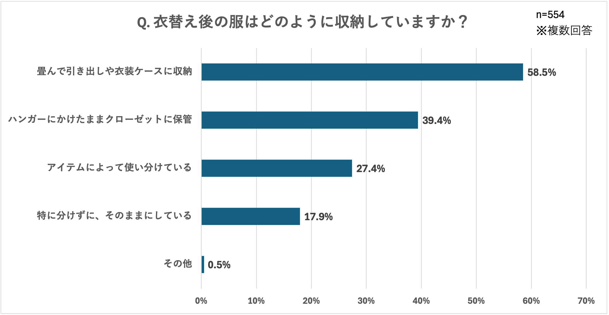 「衣替え後の服はどのように収納していますか?」を尋ねたところ、最も多かったのは「畳んで引き出しや衣装ケースに収納」(58.5%)、「ハンガーにかけたままクローゼットに保管」(39.4%)が上位に入りました。