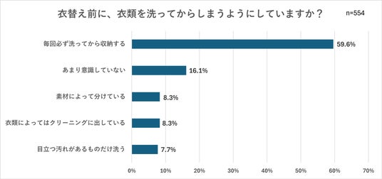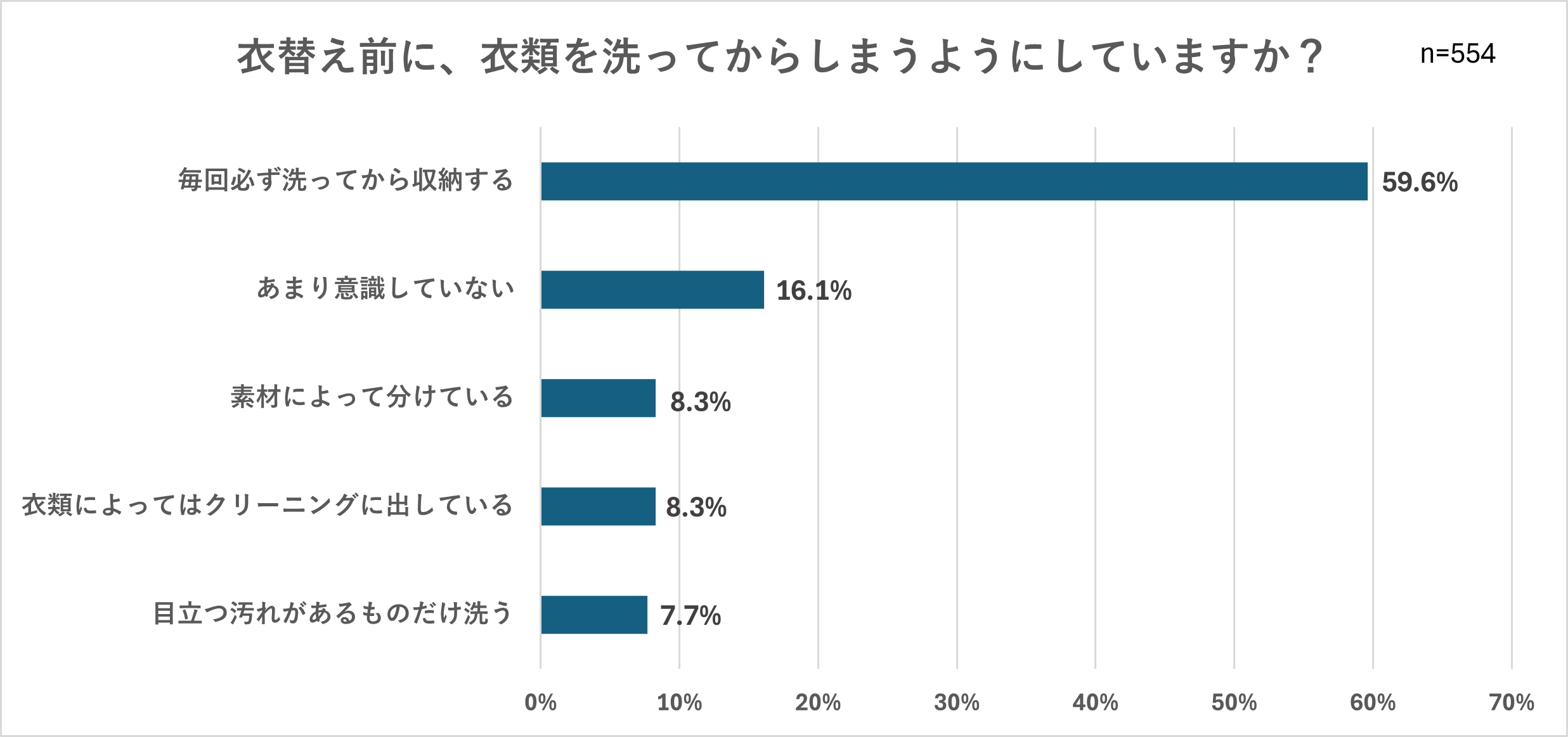 収納する」(59.6%)が一番多く、衣替えには手間や時間をかける必要があるという認識があることが伺えま