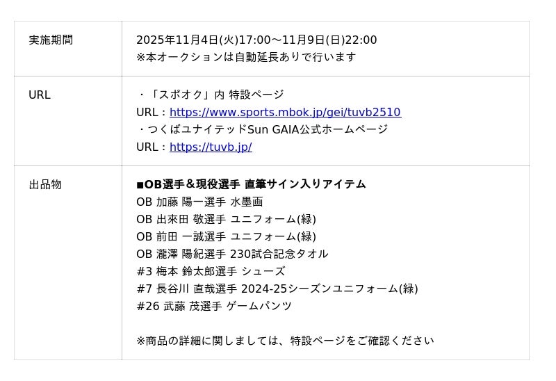【つくばユナイテッドSun GAIA 20周年記念オークションイベントオークション 概要】
