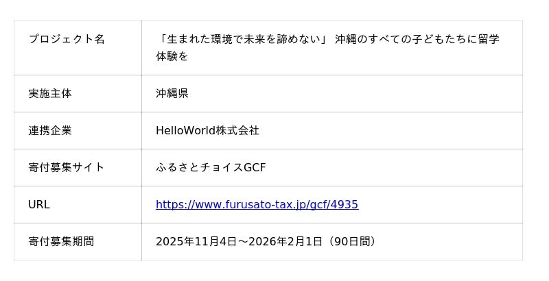 沖縄県では、経済的な環境に関わらず、県内のすべての子どもたちに多様な文化に触れる国際交流体験を届けるため、ふるさと納税制度を活用したガバメントクラウドファンディング(GCF)を2025年11月4日より開始します。