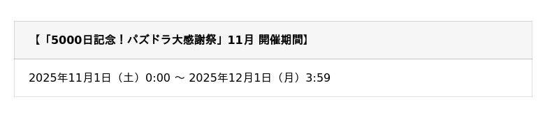 「5000日記念!パズドラ大感謝祭」を2か月にわたって実施いたします。「5000日記念!パズドラ大感謝祭」11月の目玉は、豪華報酬がもらえる特別なログインスタンプです。1日1回のログインで豪華報酬を手に入れることができ、「魔法石」を合計100個、「13周年記念たまドラ」を合計5個、獲得できるチャンス。新登場の「守霊の天体シリーズ」モンスターを追加した「大感謝祭!アンケートスーパーゴッドフェス」なども実施予定です。また、お好きなフェス限定モンスター1体が手に入るプレゼント企画や、「大感謝祭スペシャルセット」の販売、リセットイベントのリニューアルなど盛りだくさんでお届けします。どうぞお楽しみください。