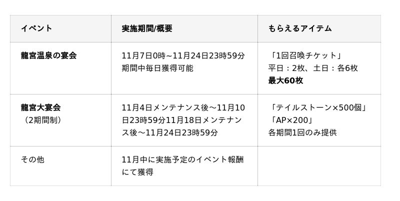 この度のアップデート実施を記念して、期間限定となりますが、「1回召喚チケット」や「テイルストーン」の配布、イベント報酬を含めて最大100回分の召喚に挑戦できる施策を実施します。