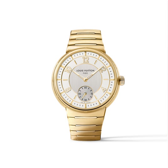 イエローゴールドのメタルブレスレットと薄型ケースを一体化させることによって、ルイ・ヴィトンのアイコニックな「タンブール」をシック & スポーティに再解釈し、新たな表情を生み出しました。美しいコントラストを描くデザインと上品なディテールで洗練された雰囲気に仕上げた、多彩なスタイルをお楽しみいただけるユニセックスモデルです。エクスクルーシブで新たな自動巻き「キャリバーLFT023」を搭載したタイムピースの文字盤には、 エレガンスと精密さの証として、「Louis Vuitton Paris, Fab. En Suisse」シグネチャーが刻印されています。