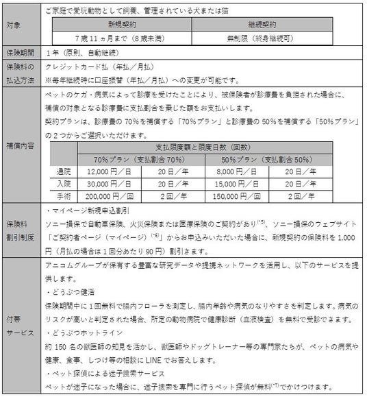 今般、2025年11月4日より共同でペット保険の販売を開始し、アニコム損保のペット保険最大手としての知見と動物病院等とのネットワーク、ソニー損保のダイレクト型保険大手としての知見を生かすことで、ペット保険の普及率を向上させてまいります。