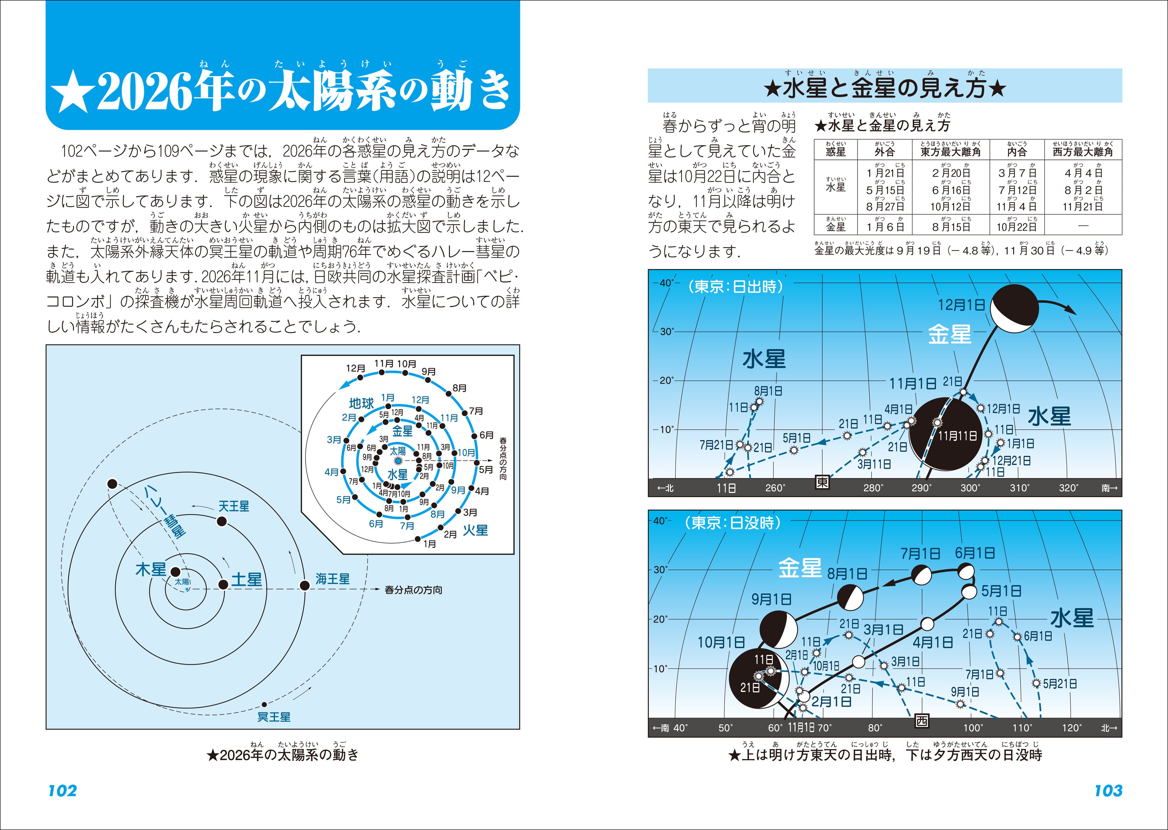2026年に起こる注目すべき天文現象として、3月3日の皆既月食、8月13日のペルセウス座流星群の極大、10月5日の土星が衝について詳しく解説するほか、しぶんぎ座流星群やふたご座流星群などの主な流星群についてなど、2026年に起こる天文現象を観察できる時刻や観察方法について紹介しながらやさしく解説。