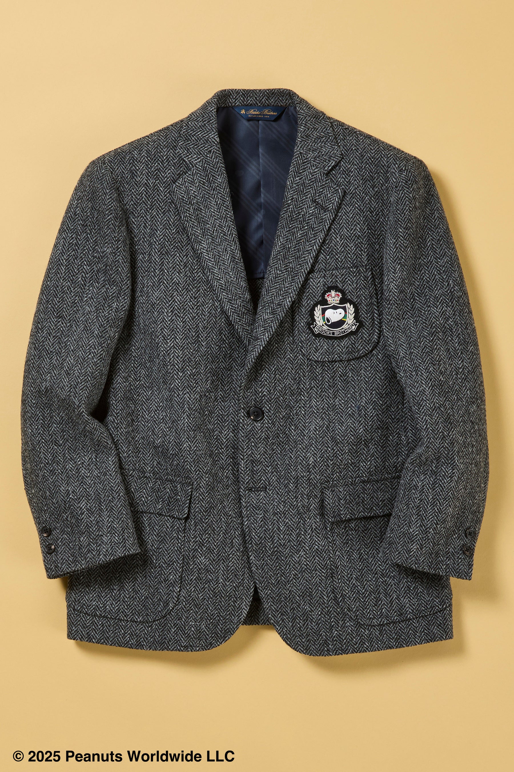 ハリスツイード社製の上質なヘリンボーン生地を使用し、ブルックス ブラザーズの代名詞である3ボタン段返りのトラディショナルフィットで仕立てました。胸元には今回のコラボレーションを象徴するスヌーピーのエンブレムを配置。裏地にはブランドを代表するBB #1ストライプとスヌーピーのモチーフを組み合わせたプリントを採用しました。クラシックなスタイルに遊び心を効かせた、限定感あふれる一着です。