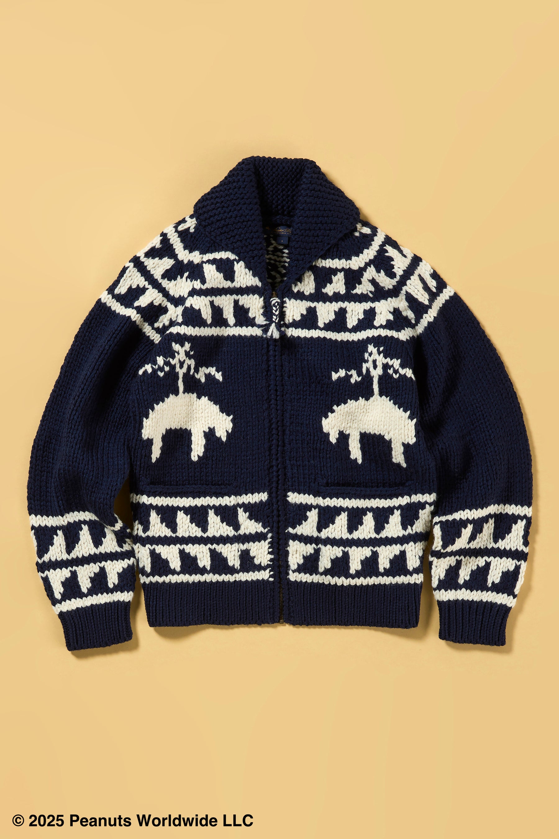 ざっくりとした編み目が魅力のウール100%カウチンニット。フロントにはブランドのシンボルであるゴールデン フリース、バックにはスヌーピーの柄を大きく編み込みました。ネイビー地にホワイトのコントラストで、大人でも着やすい落ち着いた印象に。冬のスタイルに温もりとキャラクター性を添える一枚です。