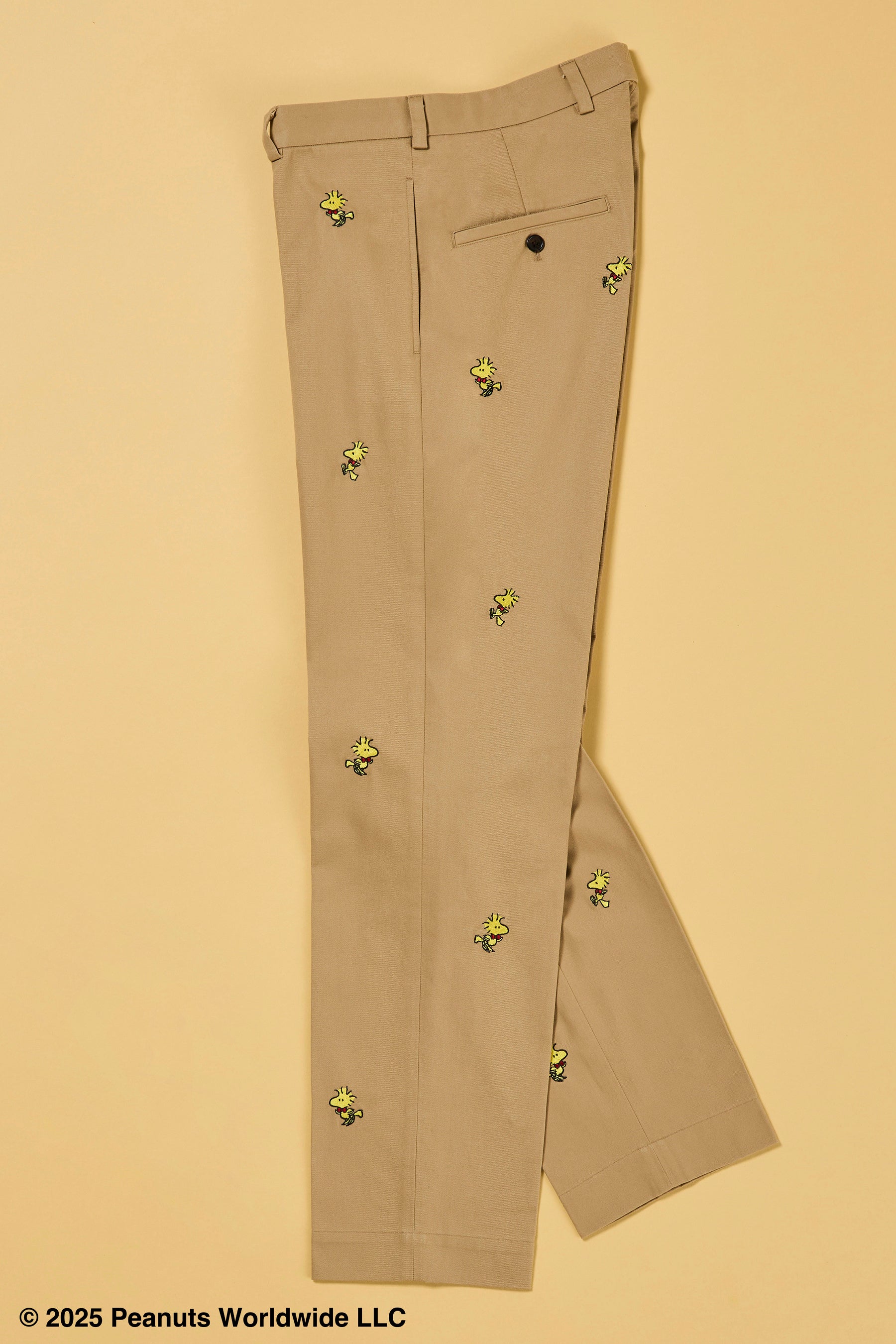 ベージュのチノパン全体に、赤いボウタイをつけたウッドストックの刺繍を散りばめました。コットン100%の生地は程よいハリがあり快適な穿き心地。レギュラーフィットのシルエットは汎用性が高く、紺ブレザーやセーターとの相性も抜群です。定番アイテムにキャラクターの魅力を加えた、着こなしの主役になる一本です。