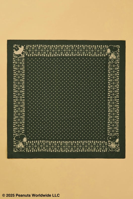 カシミア100%の薄手素材で仕立てたバンダナ風デザイン。シーズンのキー・カラーであるオリーブをベースに、スヌーピーとゴールデン フリースのモチーフをプリントしました。柔らかく軽やかな質感で、クラシックにもカジュアルにも馴染む一枚。コラボレーションならではのユニークな表情を楽しめます。