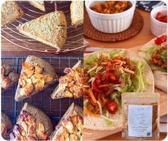「mamekuru cafe」hitosaji spice スパイスミックス(オリジナル・ハーブ・韓国風、40g)各920円、スコーン(チャイ・スパイス・かぼちゃ・チョコ、1個)各560円〔『おいしいウエルネス』限定〕、タコス(1個)780円〔『おいしいウエルネス』限定〕※イートインのみ