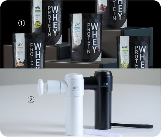 「uFit」1.ホエイプロテイン(抹茶・チョコレート風味・ヨーグルト・グリーンアップル・黒糖きな粉・アロエヨーグルト、1kg)各4,981円、2.RELEASER Mini(1個)各17,112円