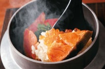 素材の味を引き立てる厳選したお米・出汁を使用し、ご注文いただいてから約20分かけてじっくり丁寧に炊き上げる、創業当初からの名物料理。お食事として、お酒の〆として、特製お出汁で「お茶漬け」にして、二度楽しむのが“かまどか流”です。