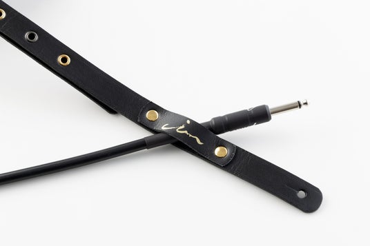 デザインから使用感までINORAN監修のもと、ステージワークにおいて必要なものを詰め込んだこのストラップは、ヴィンテージスタイルの細身のストラップで、僅かに伸縮性のあるブラックのリアルカウレザーを使用しています。重量負担を軽減するためのパッド部分にも表面には同じレザーを使用していますが、肩に当たる裏側部分には色移りのしづらいナチュラルカラーを採用。ハードウェアには、ギターとの親和性の高いゴールドが選択されており、フェンダーのロゴとINORANのサインも、ハードウェアのカラーに合わせたゴールドで刻印されています。サインが入ったパーツは僅かにたわんだ状態で縫製され、シールドケーブルを差し込むことでジャックから抜けにくくしておくことが可能です。長さ調整部分のハトメには、ゴールドと交互にブラックメッキを挟んでいるため、細めで繊細な印象のストラップと調和がとれたデザインとなっています。長さはINORANが実際にLUNA SEAを含む、様々なステージで使用することを想定して、本人による長さの検証をした上でハトメの間隔と数を調整。129cmから160cmで調整可能で、このストラップのみでINORANのあらゆるポジション、プレイスタイルに対応する設計になっています。ストラップは、小物入れなどにも使用可能なサイン入りの化粧箱に入っており、細部に至ってもINORANのこだわりが詰まっています。