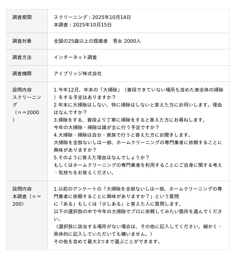 大掃除に対する現代の日本人の意識、プロのホームクリーニングサービスの利用に対する消費者の意識理解のひとつとして本調査レポートを活用いただけますと幸いです。