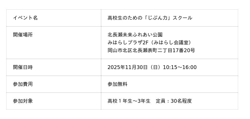 高校生のための未来づくり実行委員会(株式会社プログレス内)は、高校生のためのじぶん力スクールを2025年11月30日(日)に岡山市内で初開催します。このイベントは、「自分の将来を選択できる大人になる」をテーマに、岡山県内の高校生を対象にしたものです。進学か、就職か誰も正解を教えてくれない時代。私たちは、本イベントを通じて「高校生が、自分で決めて、自分で動ける力」を身に着けることを目指し新たな交流の場として広げていきたいと考えています。