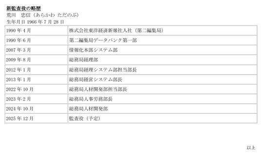 株式会社東洋経済新報社(本社 東京都中央区、代表取締役社長 山田徹也)は、2025年11月4日開催の取締役会において、第134期定時株主総会(2025年12月22日開催予定)に付議する取締役等選任議案の候補について内定いたしましたので、ご報告申し上げます。