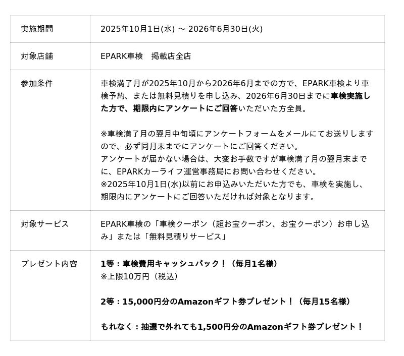車検は費用や手間がかりますが、EPARK車検なら少しでも費用を抑えたい、時間を節約したいといった希望を叶えます。本キャンペーンでは、多くのお客様にご利用いただくことを目的とし、2026年6月30日までの期間、毎月抽選で1名様に上限10万円までの車検費用キャッシュバックなど豪華なプレゼントをご用意しております。