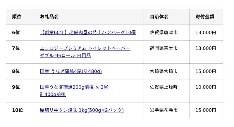 一方で、栃木県小山市の「ボックスティッシュ」が4位、静岡県富士市の「トイレットペーパー」が7位と、日用品が引き続き上位に入りました。生活必需品としての需要の高まりを背景に、より一層支持を広げています。