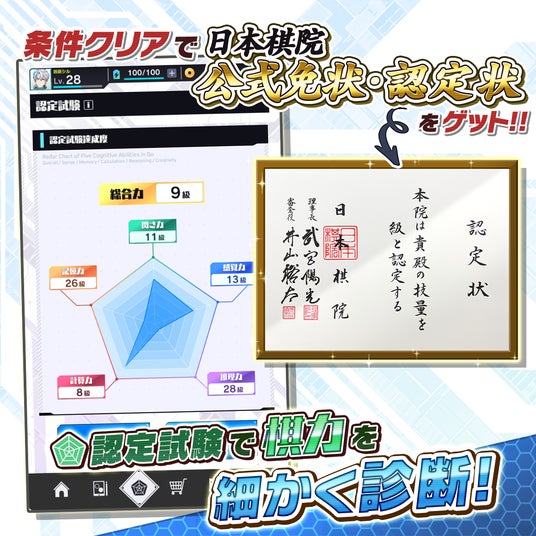 アプリ内の「認定試験」では、プレイヤーの棋力を細かく判定。一定条件を満たすと、公益財団法人日本棋院公式の級免状・認定状を申請することが可能です。「遊びながら上達し、公式に認められる」という成長体験を実現しました。