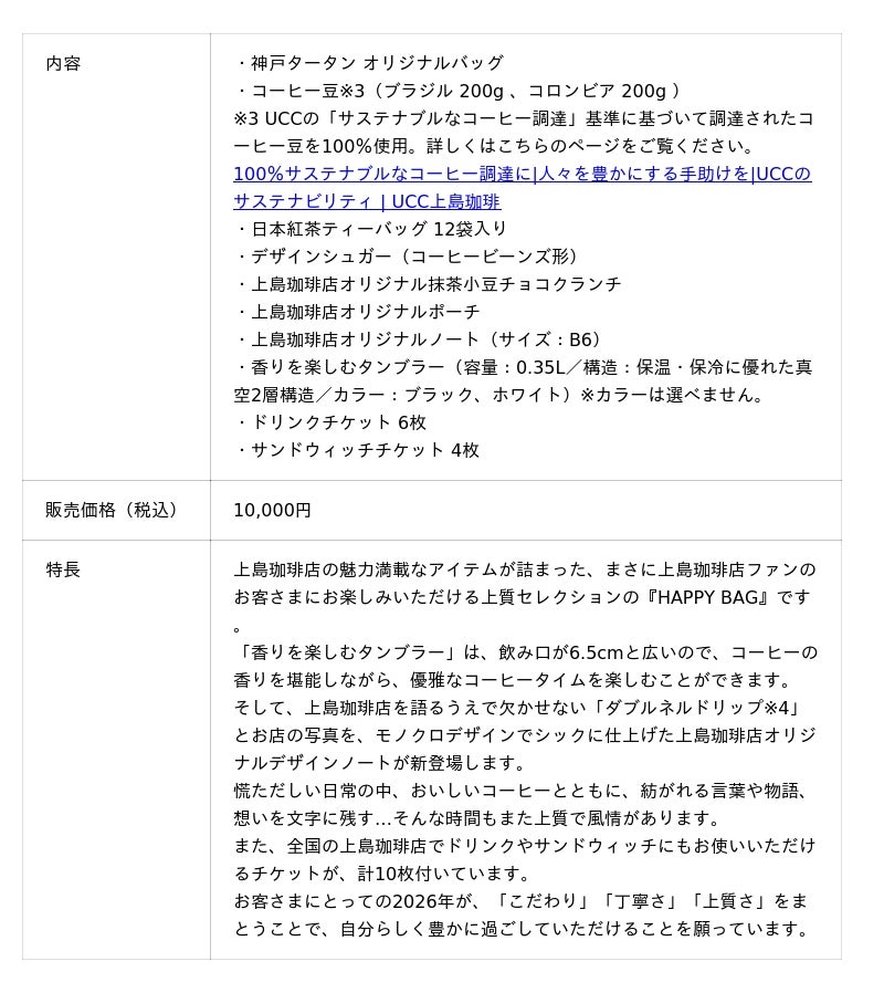 UCCグループで外食事業を担当するユーシーシーフードサービスシステムズ株式会社(本社/兵庫県神戸市、社長/川野浩司、以下UFS)は、全国の上島珈琲店(一部店舗除く)にて、2種類の福袋『HAPPY BAG 2026』の店頭予約受付を、11月6日(木)に開始します。数量限定につき、なくなり次第終了とさせていただきます。
