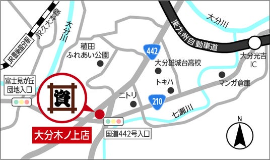 「資さんうどん大分木ノ上店」は、国道10号線からもアクセスしやすい立地です。大分自動車道「大分光吉IC」から車で約5分と利便性が高く、周辺には住宅地やい飲食店が点在します。