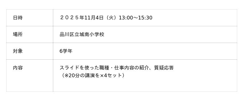 株式会社 加藤製作所(代表取締役社長:加藤 公康 以下、当社) は、品川区教育委員会が推進するキャリア教育事業「しながわドリームジョブ」に参画し、2025年11月4日(火)に品川区立城南小学校で講演しました。
