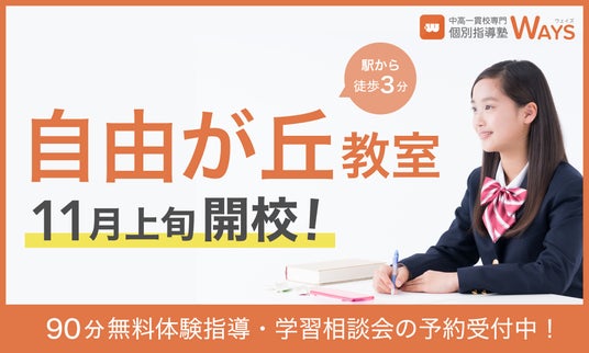 中高一貫校専門 個別指導塾WAYS(運営:株式会社メイツ、本社:東京都新宿区)は、多くの生徒様・保護者様からのご支持をいただき塾生数が増加していることを受け、「中高一貫校専門 個別指導塾WAYS 自由が丘教室」を2025年11月17日(月)に拡大移転し、リニューアルオープンいたします。