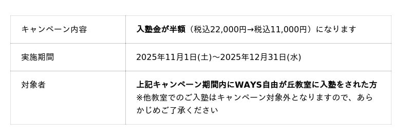 今回の拡大移転を記念し、自由が丘教室へ新規ご入会の方限定で「入塾金半額キャンペーン」を実施いたします。ぜひこの機会に、新しく快適になる自由が丘教室へお越しください。
