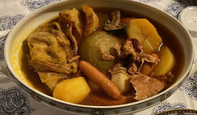 冷蔵庫整理のため、以下の食材をじっくり煮ました。整理の対象になったのはベーコン、ソーセージ、豚肉、人参、ポテト、タマネギ、キャベツ、椎茸、蕪。
