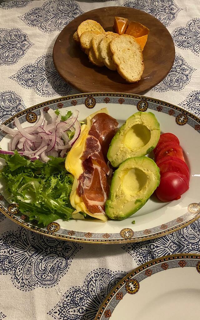 まずは「切って並べただけのお皿」=フリゼレタス、アーリーレッド、アボカド、トマト、チーズ、イベリコハム、ラスク、ミモザ(チーズ)。