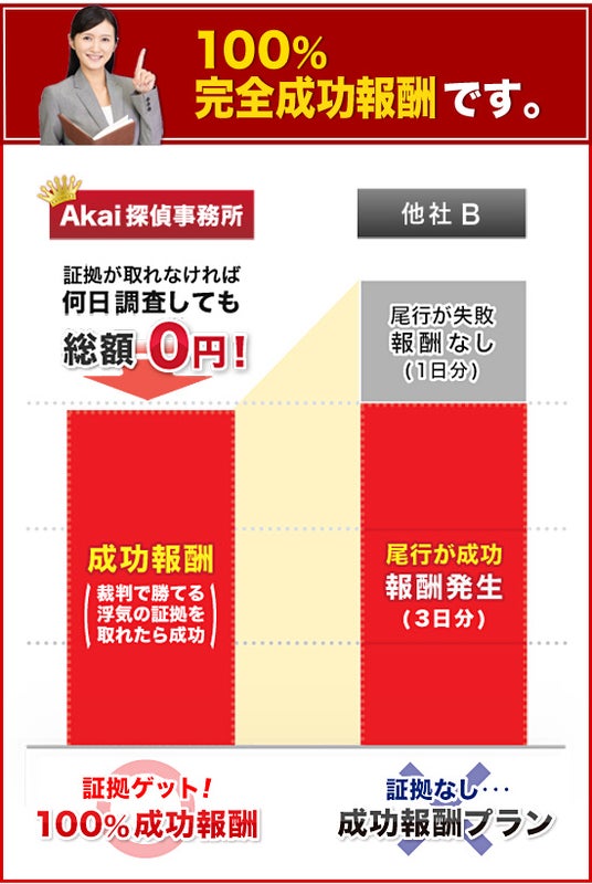 Akai探偵事務所が提供する「100%成功報酬の最安値保証サービス」は、完全成功報酬制を採用した浮気・不倫調査プランである。