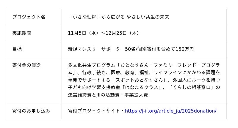 特定非営利活動法人アジア人文文化交流促進協会(東京都目黒区、理事長:石川憲彦、以下「JII」)は、2025年11月5日(水)より、「小さな理解から広がる やさしい共生の未来」寄付プロジェクトを開始しました。本プロジェクトは 12月25日(木)まで実施され、外国人と日本人がペアで交流する「おとなりさん・ファミリーフレンド・プログラム」をはじめ、行政手続き、医療、教育、福祉、ライフラインにかかわる課題を単発でサポートする「スポットおとなりさん」、外国にルーツを持つ子どもたちへの日本語学習支援「はなまるクラス」や、生活課題に専門家と連携して取り組む「くらしの相談」など、JIIが展開する多文化共生の活動の運営を強化するために活用します。