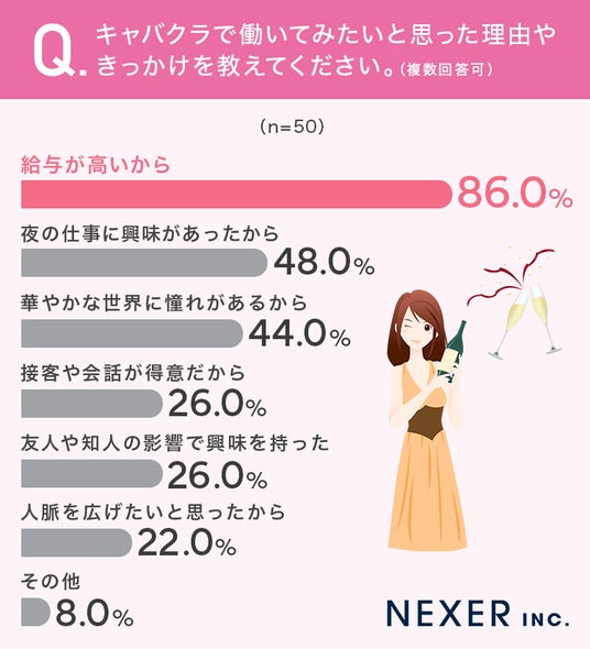 ■キャバクラで働いてみたい理由、86%が「給与が高いから」