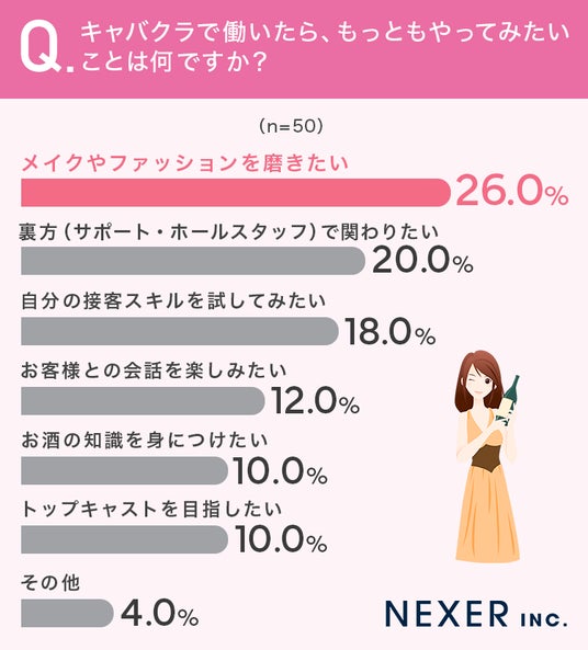 また、実際にキャバクラで働くことを想像した際、「メイクやファッションを磨きたい」と答えた人が最も多く、外見や自分磨きへの意識の高さがうかがえました。