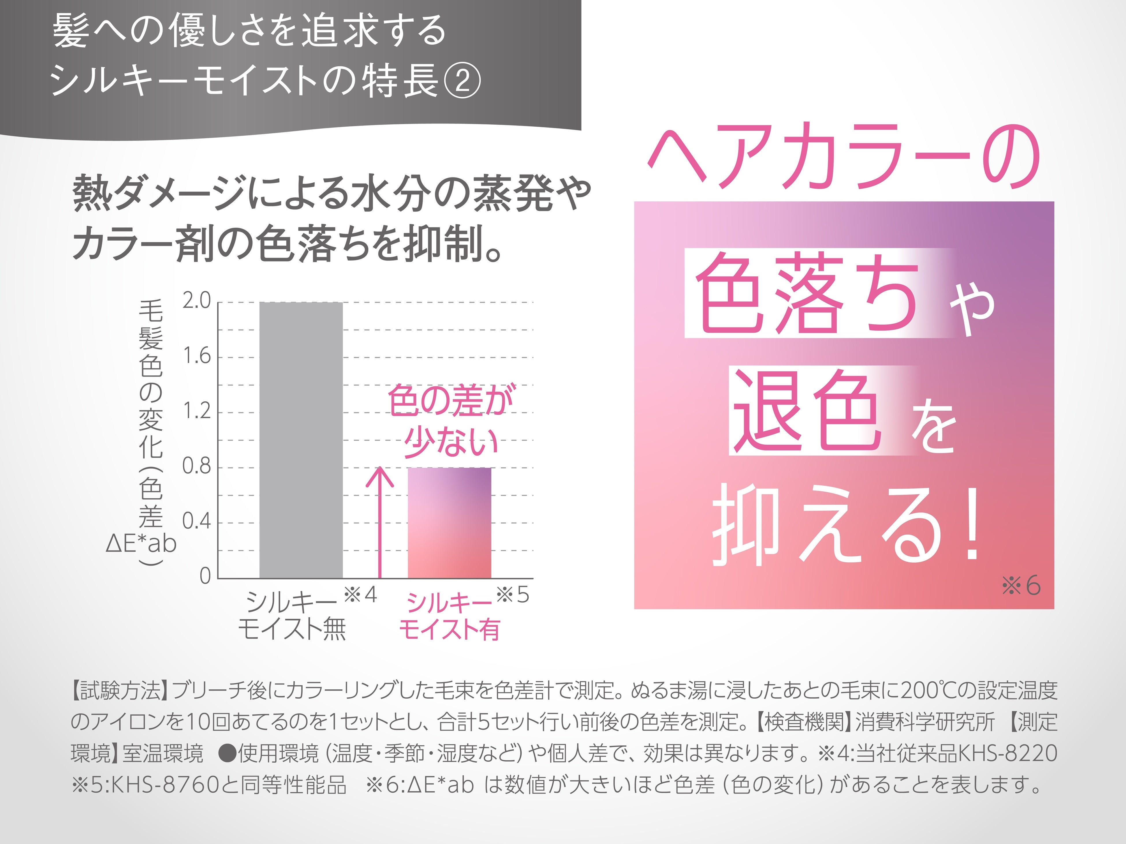 ・絹のように織り込まれた「シルキーモイスト加工」のプレート表面素材が、水分の蒸発・沸騰を抑えてうるおいをキープ。熱ダメージから髪を守る。
