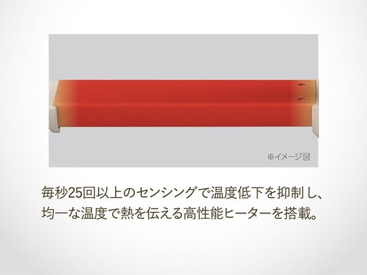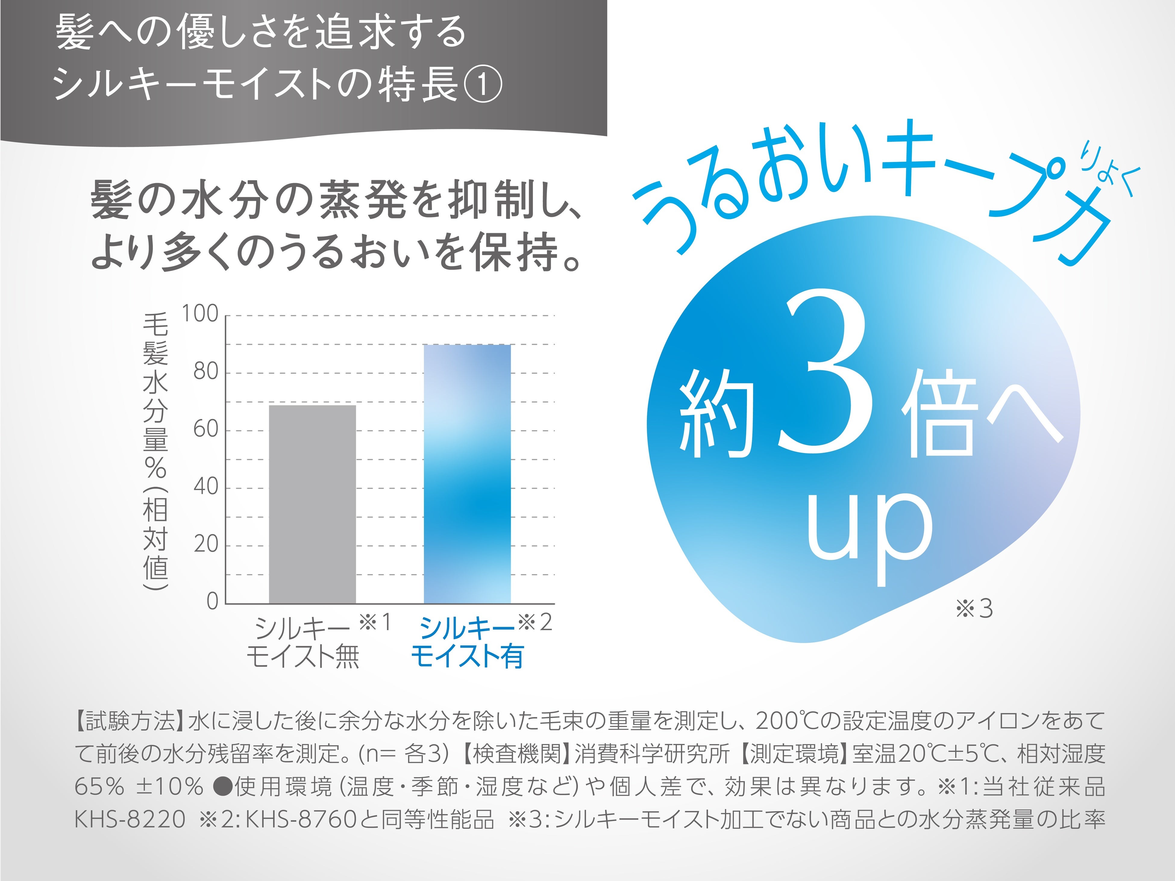 ・絹のように織り込まれた「シルキーモイスト加工」のプレート表面素材が、水分の蒸発・沸騰を抑えてうるおいをキープ。熱ダメージから髪を守る。