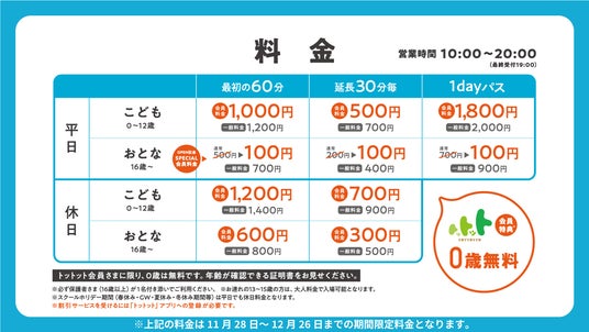 OPEN記念SPECIAL会員料金は11月28日~12月26日までの期間限定で、おとな平日料金が100円になります。