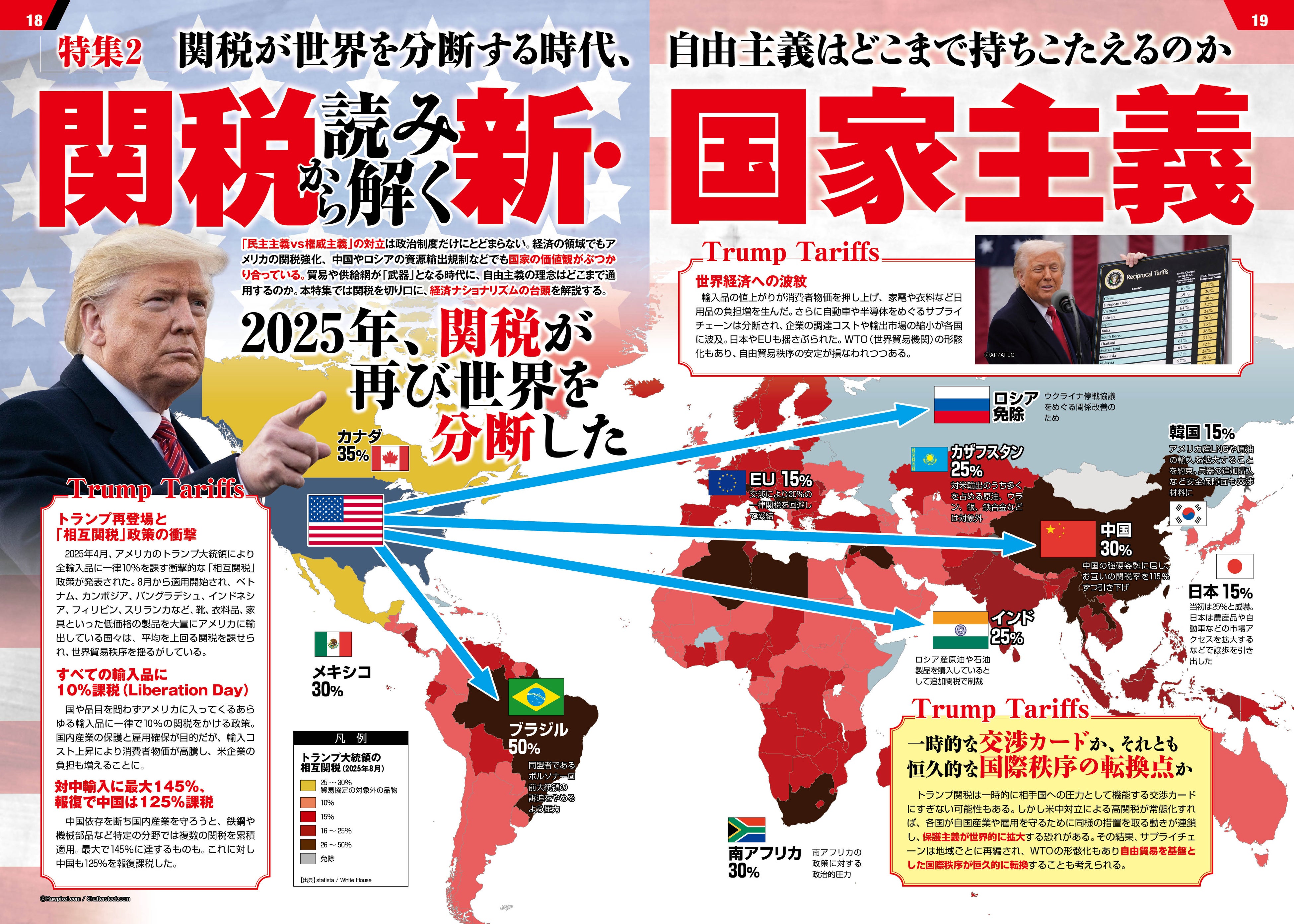 2003年に創刊した「なるほど知図帳」の最新刊、2026年版を今年も発売します。今回も巻頭特集を中心に最新の情報にアップデート。世界編の第1特集では世界各地で深まる分断と混迷する国際情勢を特集した「民主主義vs権威主義」、第2特集ではトランプ関税とその後の各国の動き、新たな潮流を解説する「関税から読み解く新・国家主義」を取り上げました。