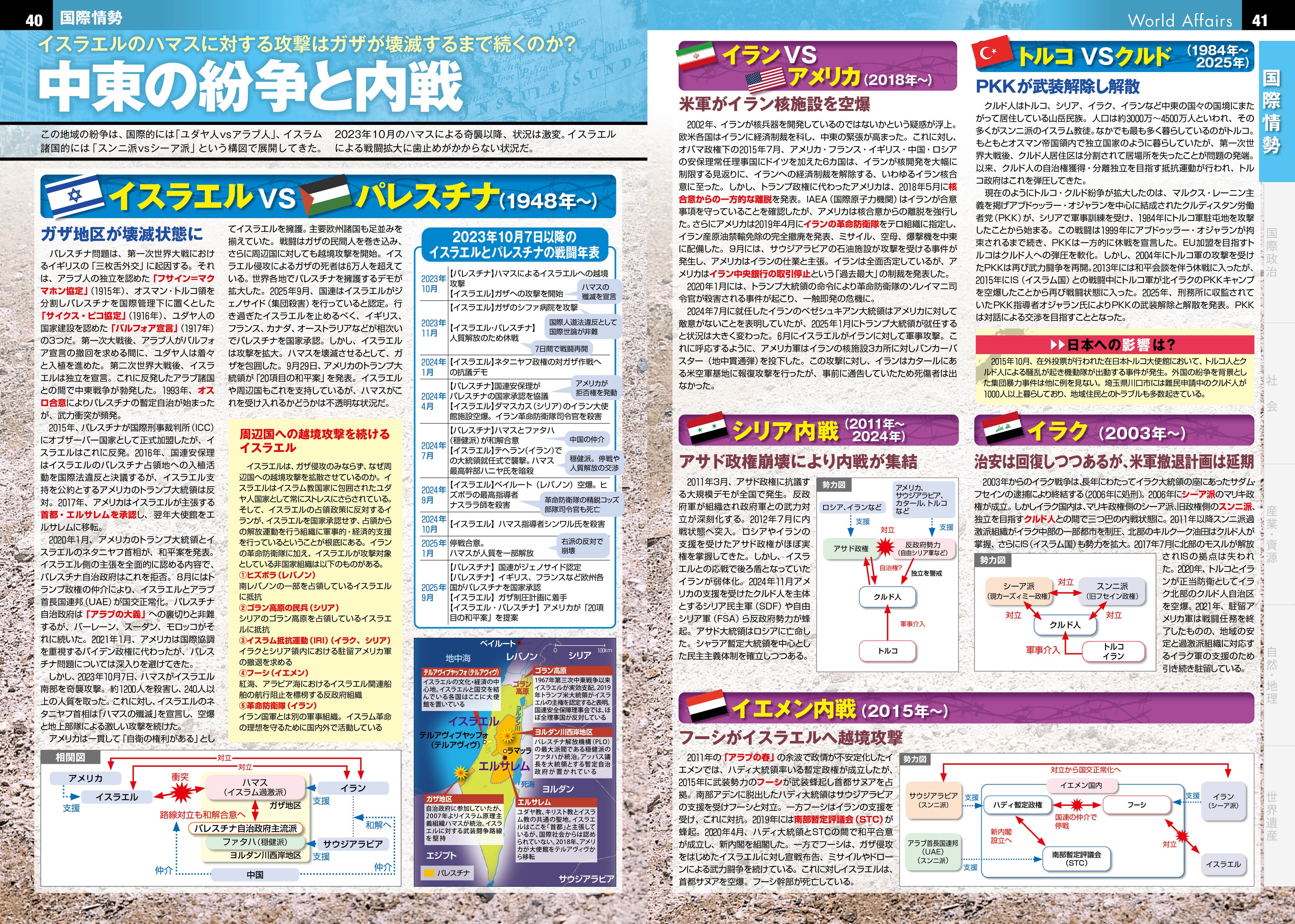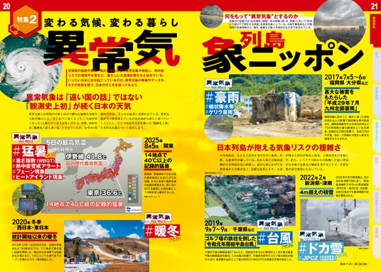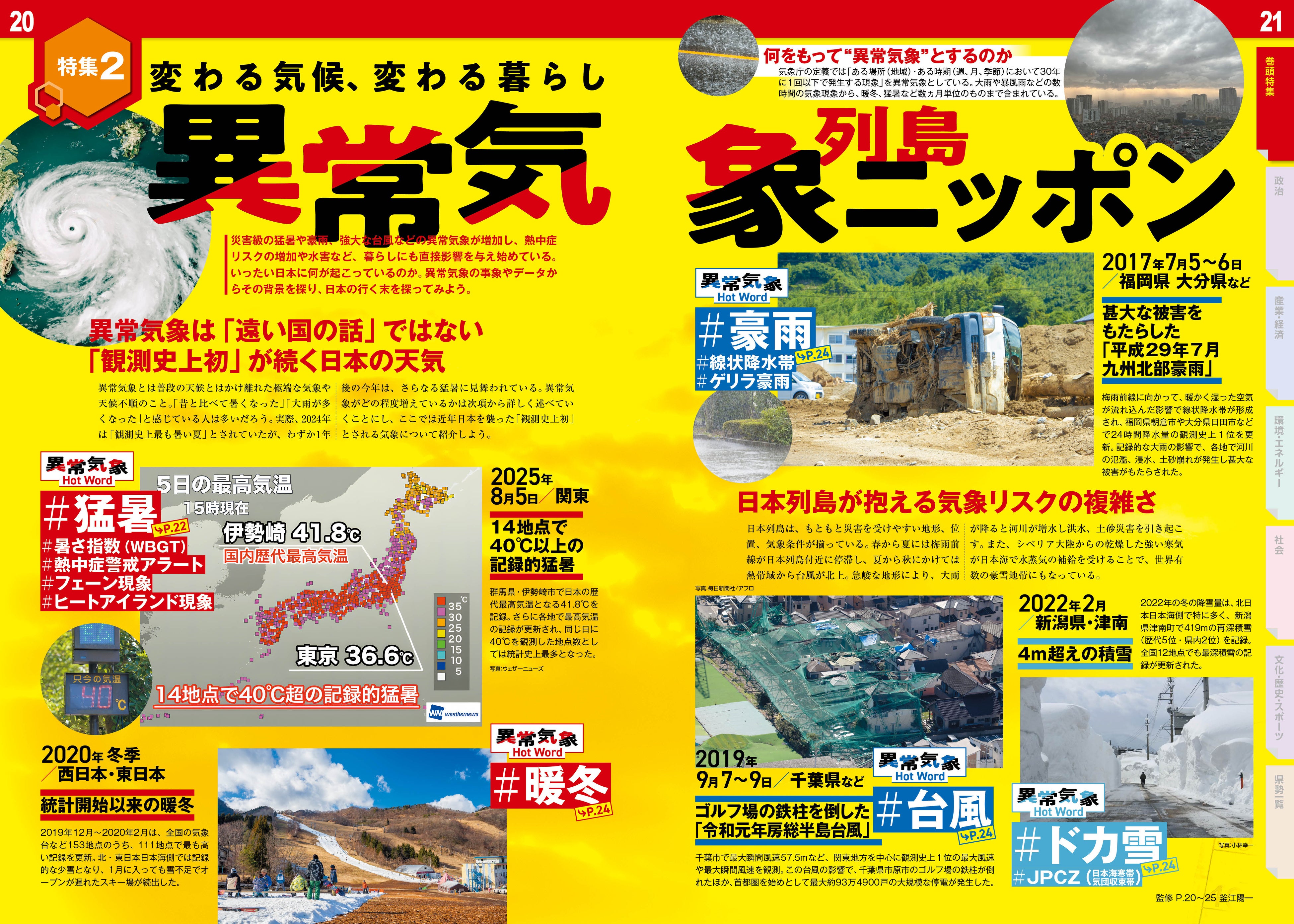 日本編では八潮市道路陥没事故に象徴されるインフラの老朽化に焦点を当てた「日本のインフラの現在地」で建築後50年以上経過する老朽施設の問題等を特集。第2特集では「異常気象列島ニッポン」と題し、観測史上初の事象が頻発し暑さや豪雨の被害が深刻化する日本の気象を取り上げています。