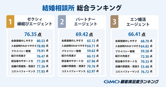 GMOインターネットグループで、インターネットリサーチ事業を展開するGMOリサーチ&AI株式会社(代表取締役社長:荻田 剛大 以下、GMOリサーチ&AI 略称:GMO-R&AI)は、同社が運営する「GMO顧客満足度ランキング」における、2025年の「結婚相談所」(※1)カテゴリのランキング結果を2025年11月5日(水)に公開しました。同カテゴリの総合ランキングでは、ゼクシィ縁結びエージェントが1位に輝きました。同サービスは「サポートの手厚さ」「登録者の質」など全7項目すべてで首位を獲得し、他社を圧倒する結果となりました。
