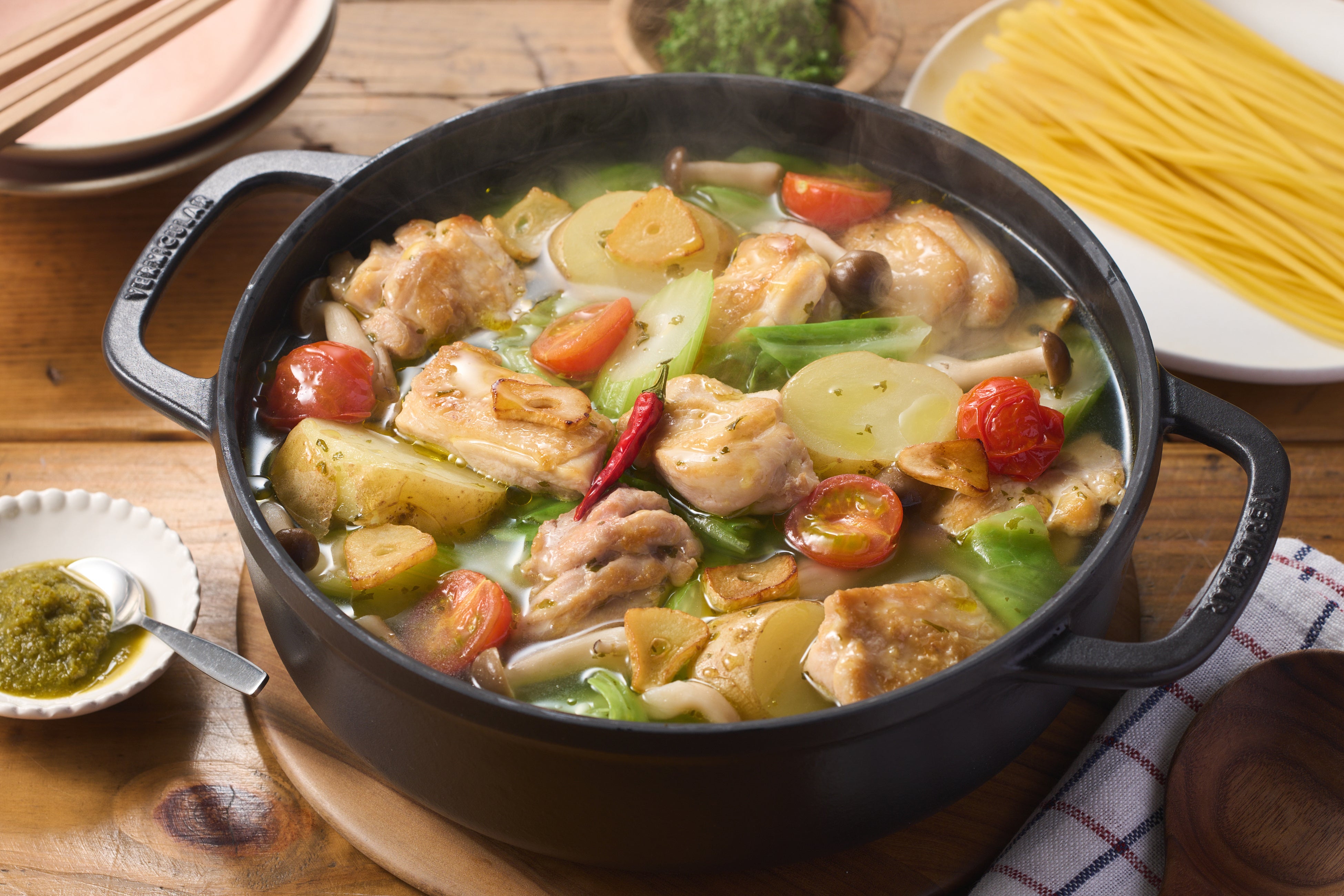 商品説明:鶏と野菜の旨みが溶け出したスープの仕上げには、こんがりと焼き上げたにんにくオイルをジュワッと回しかけて、食欲をそそる香ばしさをプラス!〆は旨みたっぷりのスープにパスタを加えて、ペペロンチーノ風をお楽しみください。