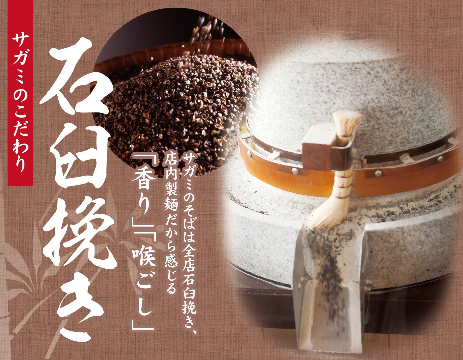 ■石臼挽き国産そば 厳選素材「国産そば」を「挽きたて」「打ち立て」「湯がきたて」にこだわり、毎日店頭の石臼でそばの実を挽き、毎日かかさず店頭で製麺し、注文のたびに湯がくことを全店行っています。