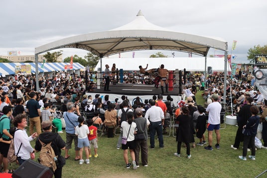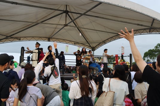 今年はプロレスリングを初設置。九州プロレス所属選手や小郡市出身・伊藤麻希選手のプロレス試合には、選手コールに拍手と熱い声援が送られました。