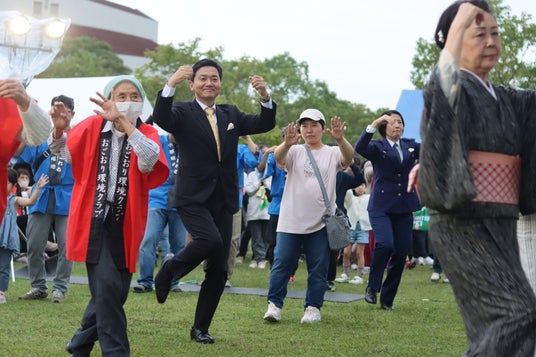 ミニ救急車などの試乗やグルメ出店も充実したまつりのフィナーレは、リングを囲んで「小郡音頭」などの総踊りと餅まき。約7千人が訪れた小郡市民まつりは、最後まで熱気に包まれました。