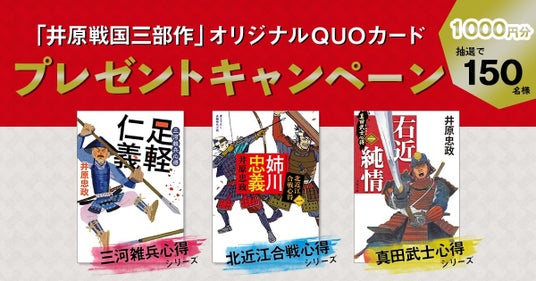 井原忠政さん「戦国三部作」幕開けを記念して、「三河雑兵心得」シリーズの双葉社、「北近江合戦心得」シリーズの小学館と三社合同で、オリジナルQUOカードが当たるプレゼントキャンペーンを実施しています。