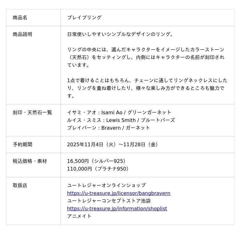 株式会社ユートレジャー(本社:東京都新宿区、代表取締役社長:青木 興一、株式会社ケイ・ウノの連結子会社)は、オリジナルTVアニメ「勇気爆発バーンブレイバーン」とのコラボレーションアイテム「ブレイブリング」の予約受付を2025年11月4日(火)~11月28日(金)の期間、ユートレジャーオンラインショップ、ユートレジャーコンセプトストア池袋にて行います。
