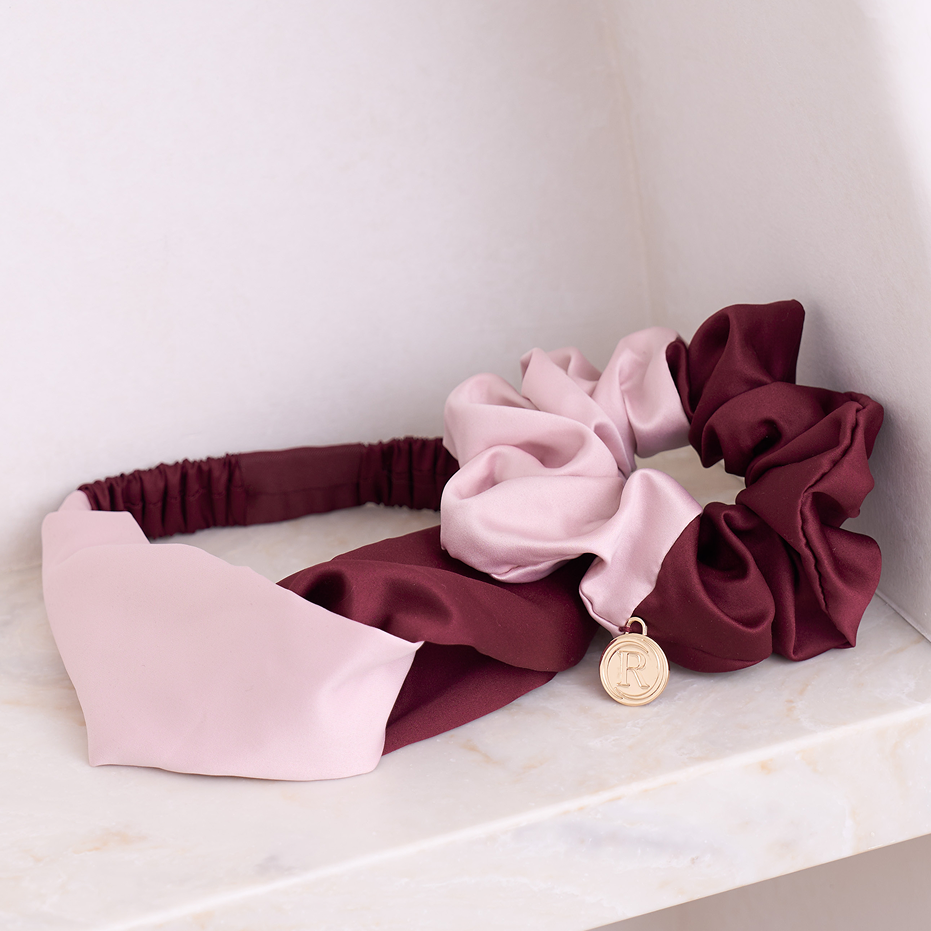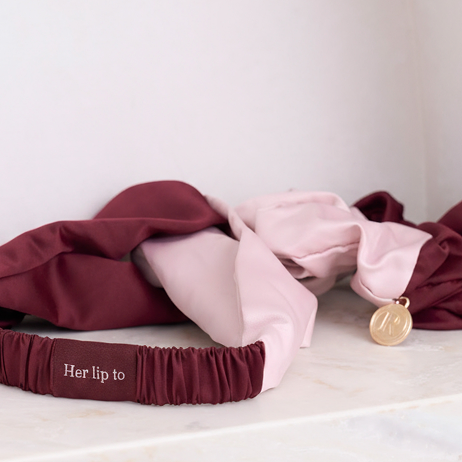 ROSIER by Her lip toを象徴するアースレッドと、Her lip to BEAUTYのモーヴのバイカラーが目を引く、オリジナルヘアバンドとシュシュ。